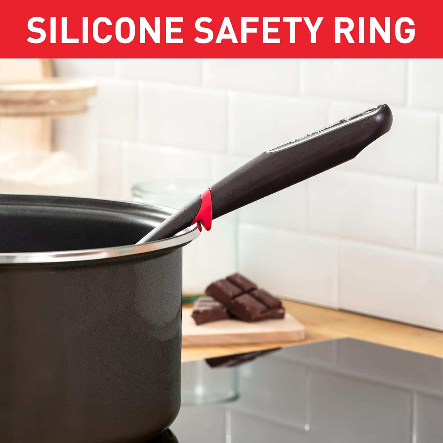 - Anillo de seguridad de silicona: Evita que la cuchara se resbale y caiga en la olla, y protege el mango del calor.